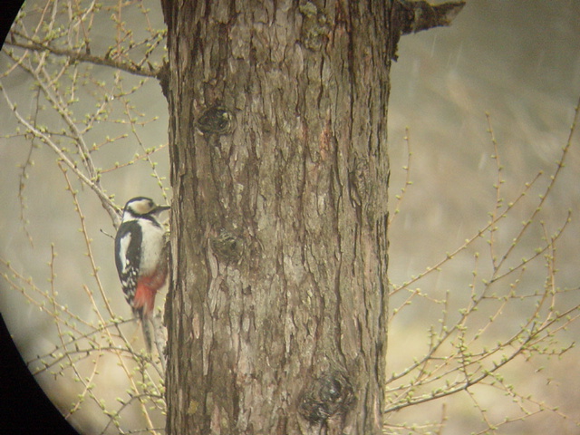 庭先の唐松に来たアカゲラを20倍のフィールドスコープにデジカメを密着させて撮影してみました。