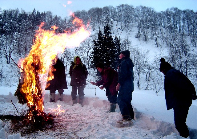 私が住む黒淵でも、昼過ぎには部落の人たちが集まって山の神様の祠と水神様の石碑を3mの雪の下から掘り出し、雪を踏んで柴燈を燃やすための広場を大小2箇所作りました。 本番は夕方5時から。 写真は小さい方のお柴燈です。 腹が減っていたので少し焦げた団子を4個も食ってしまいました。 今年は元気に北海道へ釣りに行けるでしょう。