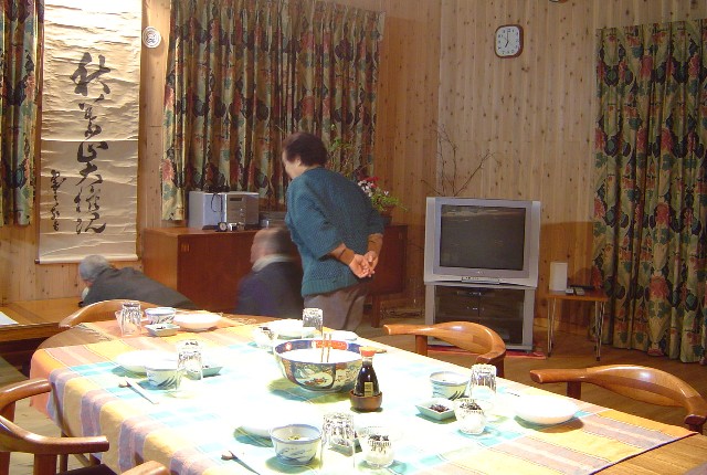 「秋葉山大権現」(火の神様です。)の掛け軸(100年ほど前のもの)を下げ、お神酒、ろうそく、塩を供え、全員で火の災いからの安全を祈願します。 あとは軽い宴会です。 決まりは山菜と米粉で作った団子の澄まし汁をいただくこと。 偶然なんですが、昨日は私の実家からもち米の粉が届き、すっかり助かりました。