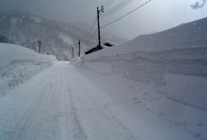 我が家の前を走る県道沿いの雪の壁は、バカの壁などよりもずっと高く、厚く、そして硬くて、その前に立つとあきらめに似た無力感に襲われます。