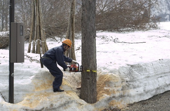 幹の直径40cm、高さ20数メートルの大木を1本5分ほどでがっかりするほど簡単に倒してしまいます。