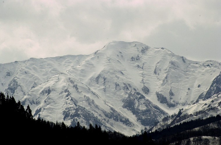 雨の合間の薄日の下で、障子ガ岳の急斜面が光っていました。