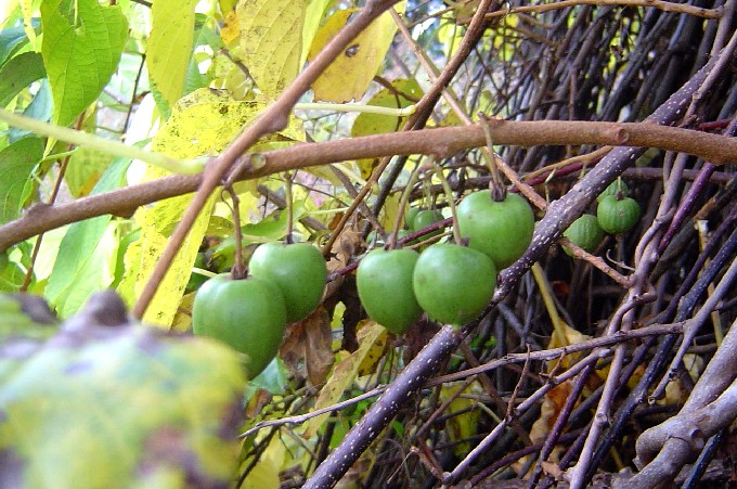 大きさはサクランボほど。 熟しても色は緑のままです。 木は蔓状で、果実の断面もキウィによく似ています。 多分キウィの仲間なのでしょう。