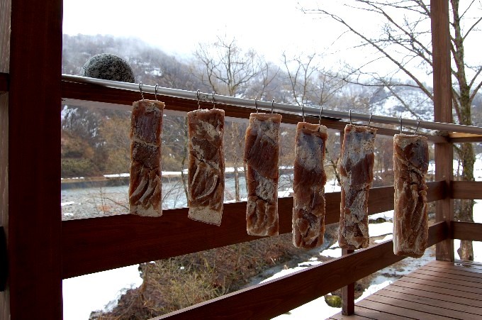留守の間に漬け込んで置いた豚のバラ肉を一晩塩抜きをして、テラスで風干しをしています。