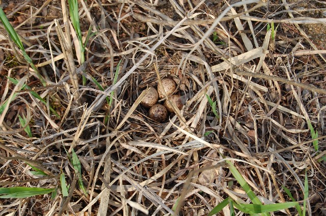 すぐそばの地面に巣がありました。 卵を温めていた親鳥が私の注意を巣から逸らすために変な飛び方をしたのでしょう。 気付かなかったとは言え、とても申し訳のないことをしてしまいました。 巣を放棄してしまわなければいいのですが。 これからはこの辺りを歩き回らないようにします。