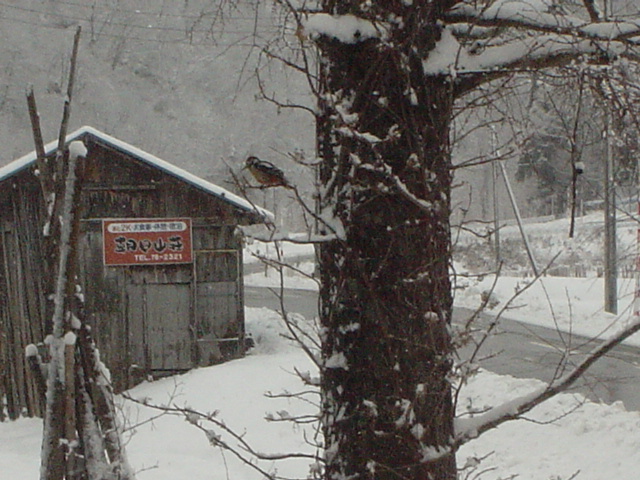 窓の外で、唐松にからんだ蔦漆に止まったアカゲラが朝日山荘の看板を見つめています。 昼飯に蕎麦でも・・・と考えてるんでしょうが、朝日山荘は冬季休業中です。